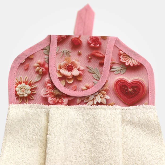 Asciughino in spugna color latte con appendino realizzato in tessuto fantasia rose e cuori e fascia in tela Aida 55 fori sul fondo. La parte superiore è dotata di una chiusura a strappo e di un’asola per poter appendere l’asciughino ai ganci della cucina o alla maniglia del forno.