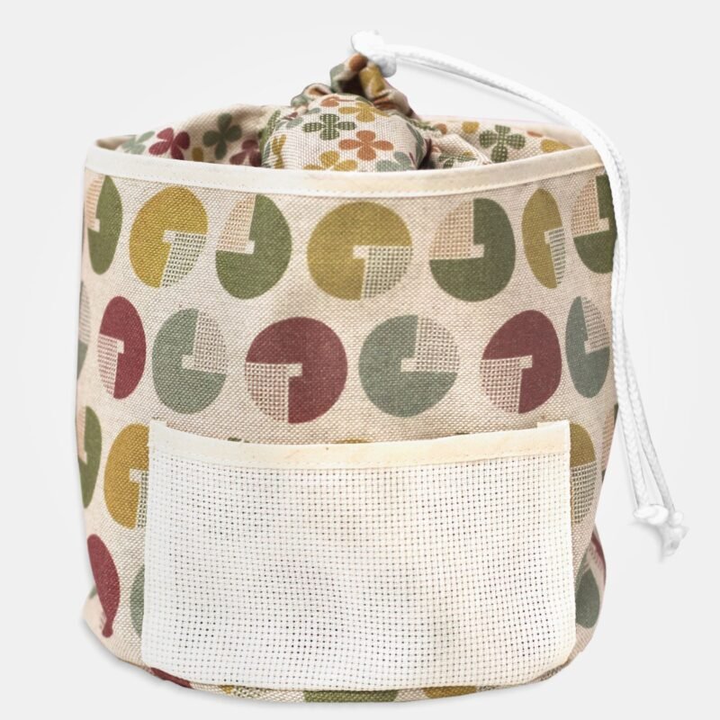Cestino porta pane rotondo a forma di secchiello con taschina in tela Aida bianca 55 fori da ricamare a punto croce. Il cestino è realizzato in tessuto fantasia “multicolor”.