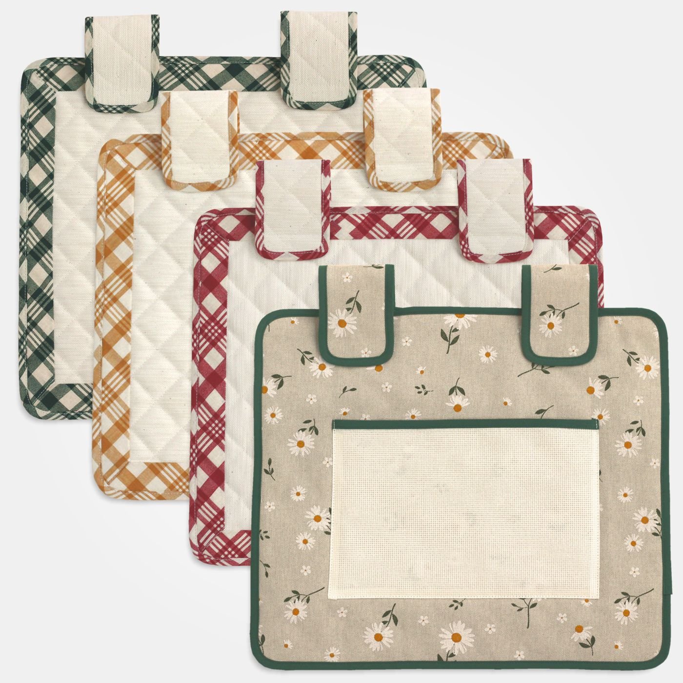 Copriforno piccolo in tessuto trapuntato e bordi a quadretti colorati, con appendini a strappo e rettangolo in tela aida al centro.