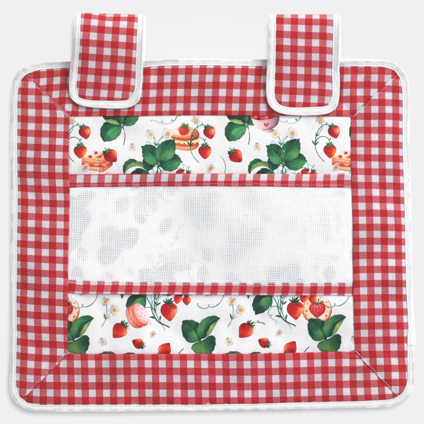 Copri forno piccolo in tessuto bianco fantasia fragole con retro trapuntato, con due appendini a strappo e grande tasca centrale in tela Aida da ricamare.