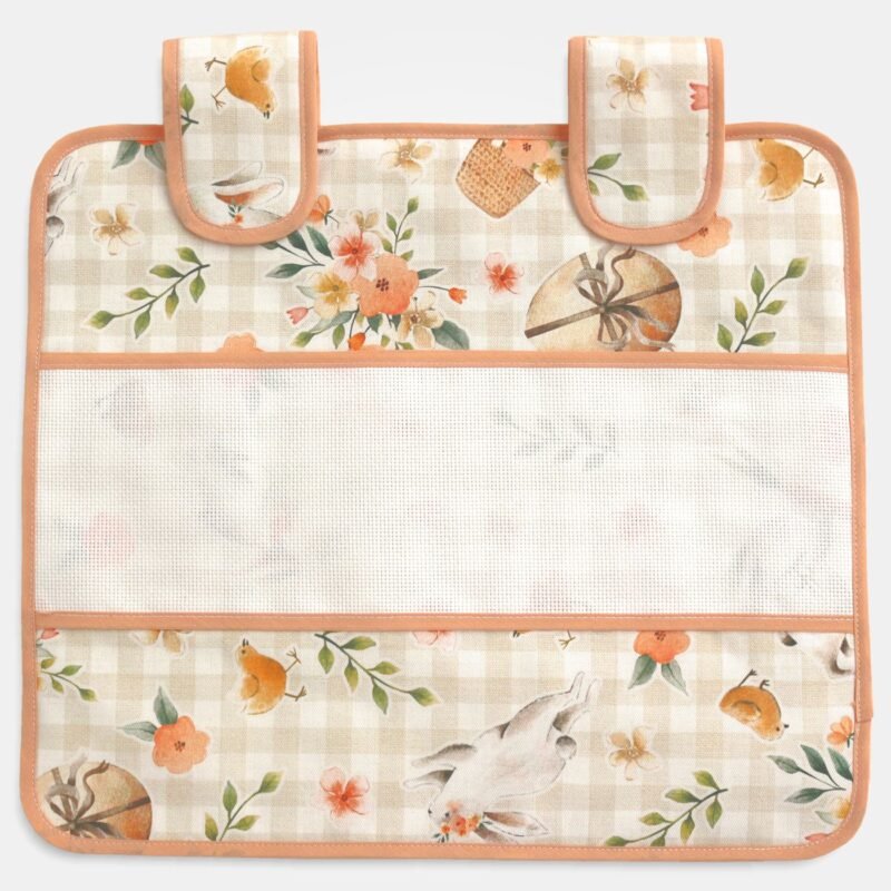 Copri forno piccolo in tessuto pasquale con retro trapuntato, con due appendini a strappo e grande tasca centrale in tela Aida da ricamare.
