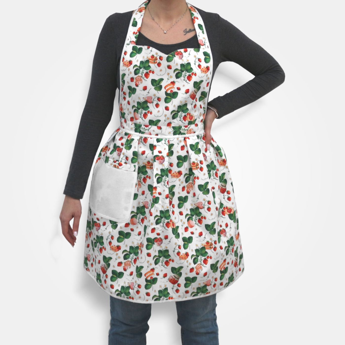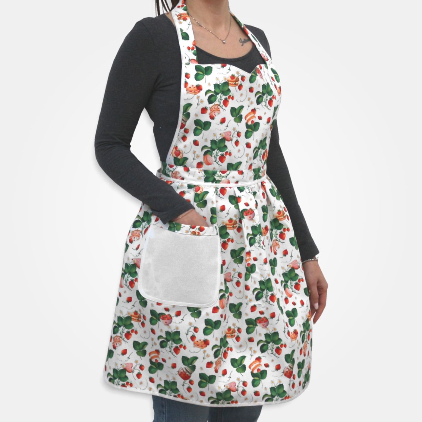 Grembiule con gonna a ruota da cucina, caratterizzato da scollo a cuore in tessuto bianco a fantasia fragole e tasca in tela Aida da ricamare a punto croce