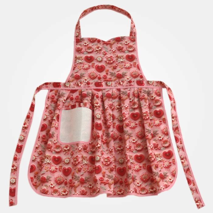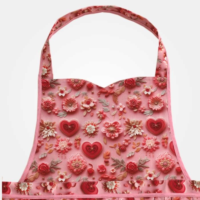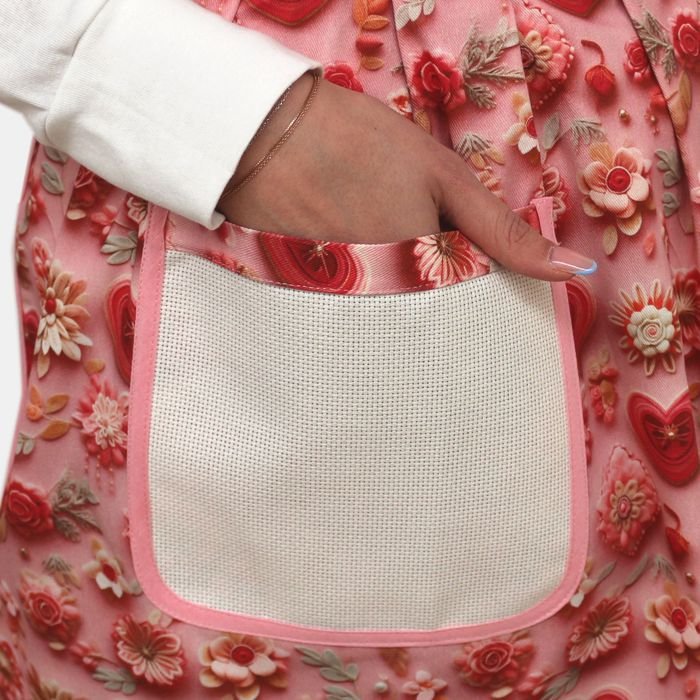 Romantico grembiule da cucina con gonna a ruota, caratterizzato da scollo a cuore e realizzato in tessuto rose e cuori sul lato è cucita una tasca in tela Aida da ricamare a punto croce.