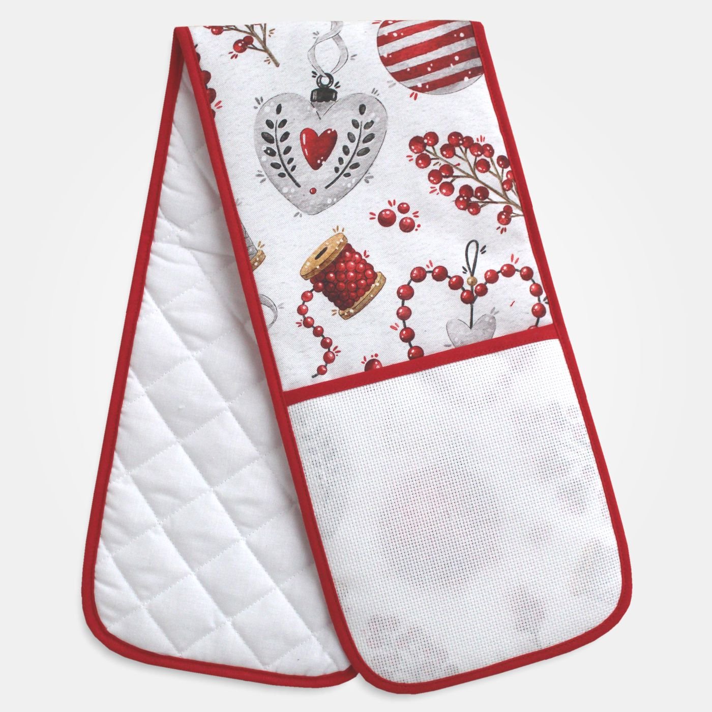 Guantone doppio da forno, in tessuto trapuntato in fantasia natalizio cuori rossi, e doppia tasca in tela Aida da ricamare.