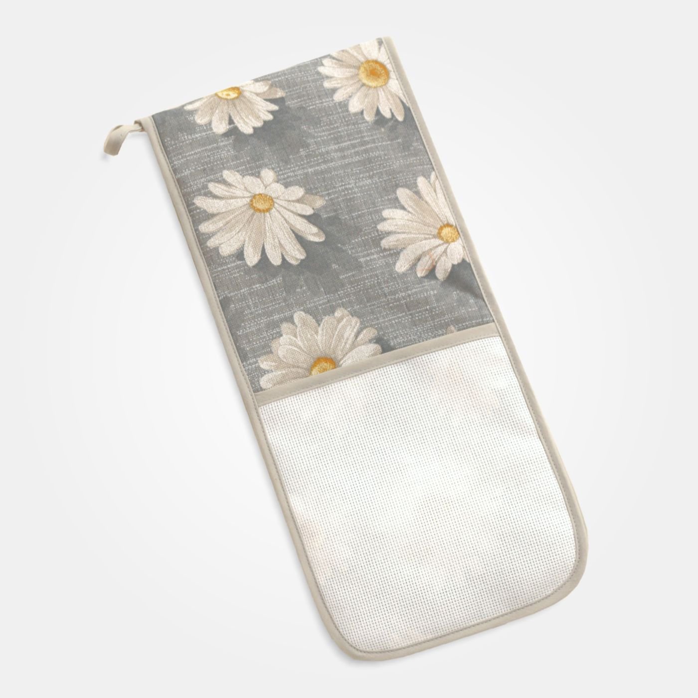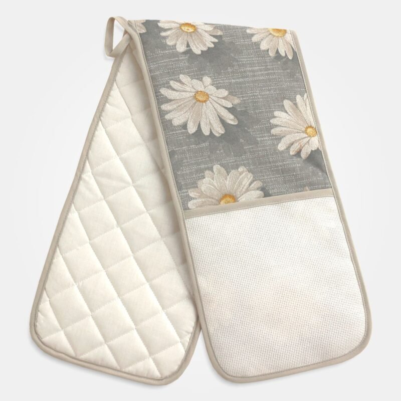 Guantone doppio da forno, in tessuto trapuntato in fantasia margherite, e doppia tasca in tela Aida da ricamare.