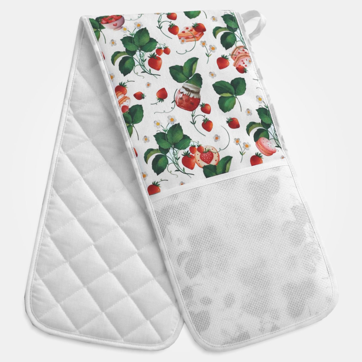 Guantone doppio da forno, in tessuto bianco a fantasia fragole con interno trapuntato, e doppia tasca in tela Aida da ricamare.