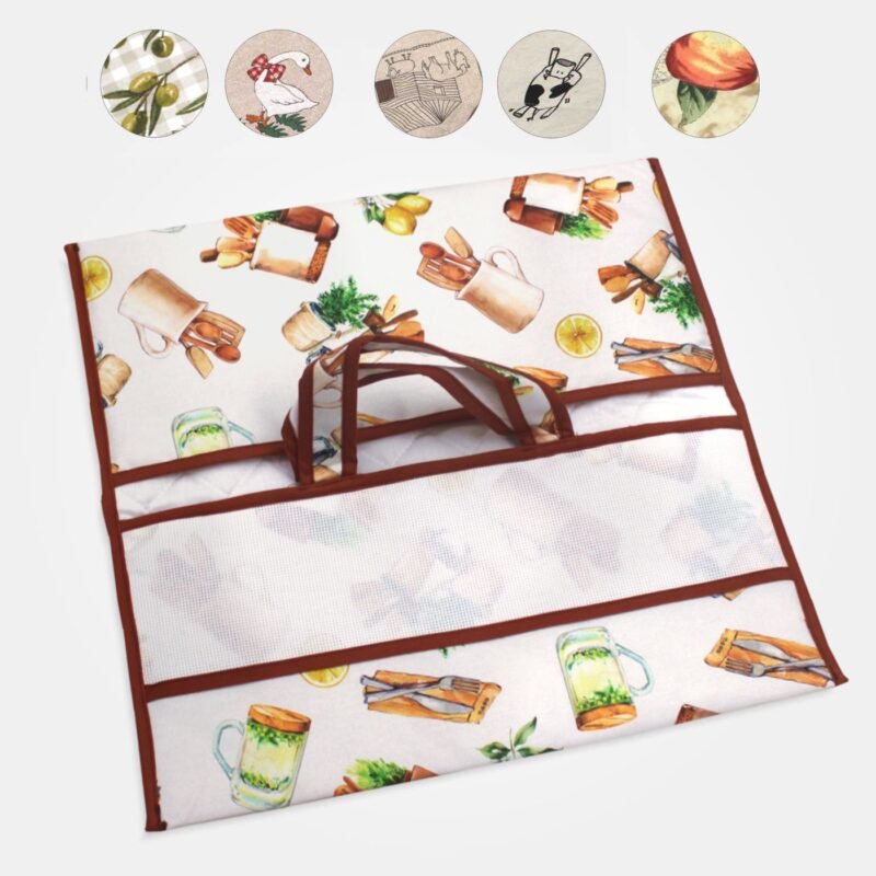 Porta torte in tessuto a fantasie con inserto in tela Aida 55 fori da ricamare a punto croce.