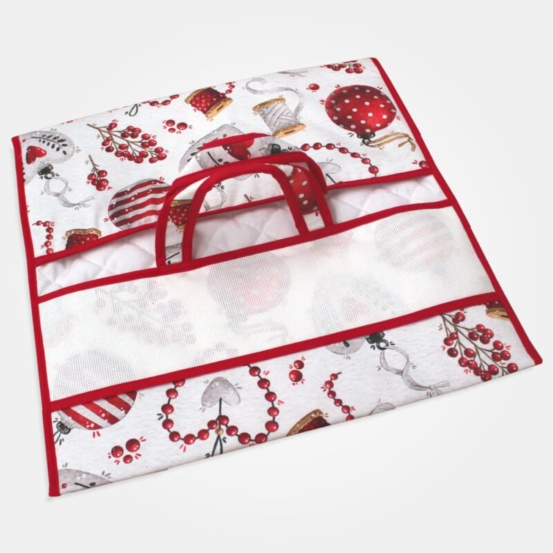 Porta torte in tessuto a fantasia Natalizio cuori rossi con inserto in tela Aida 55 fori da ricamare a punto croce.