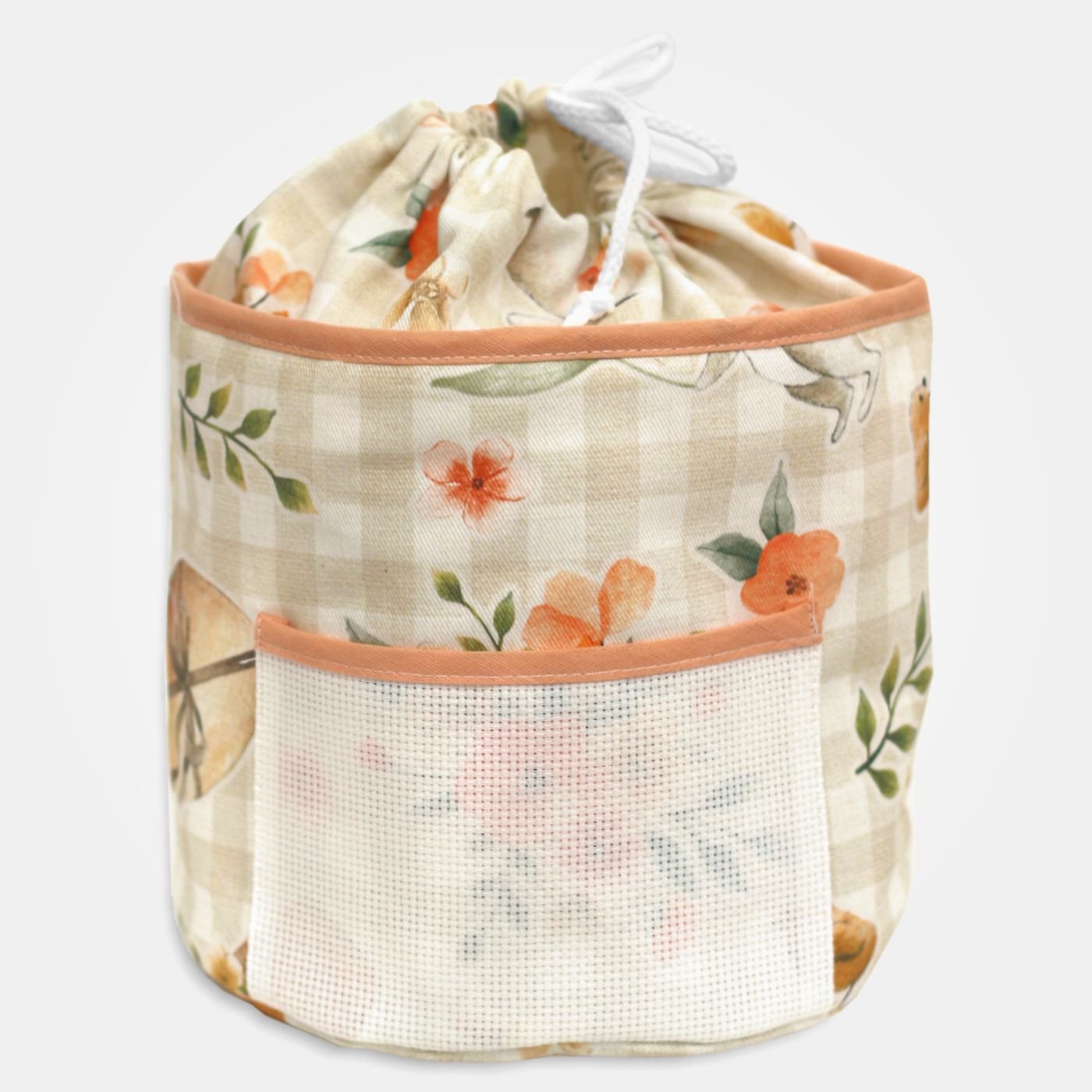 Cestino porta pane a secchiello, taschina in tela Aida 55 fori da ricamare a punto croce e chiusura con coulisse.