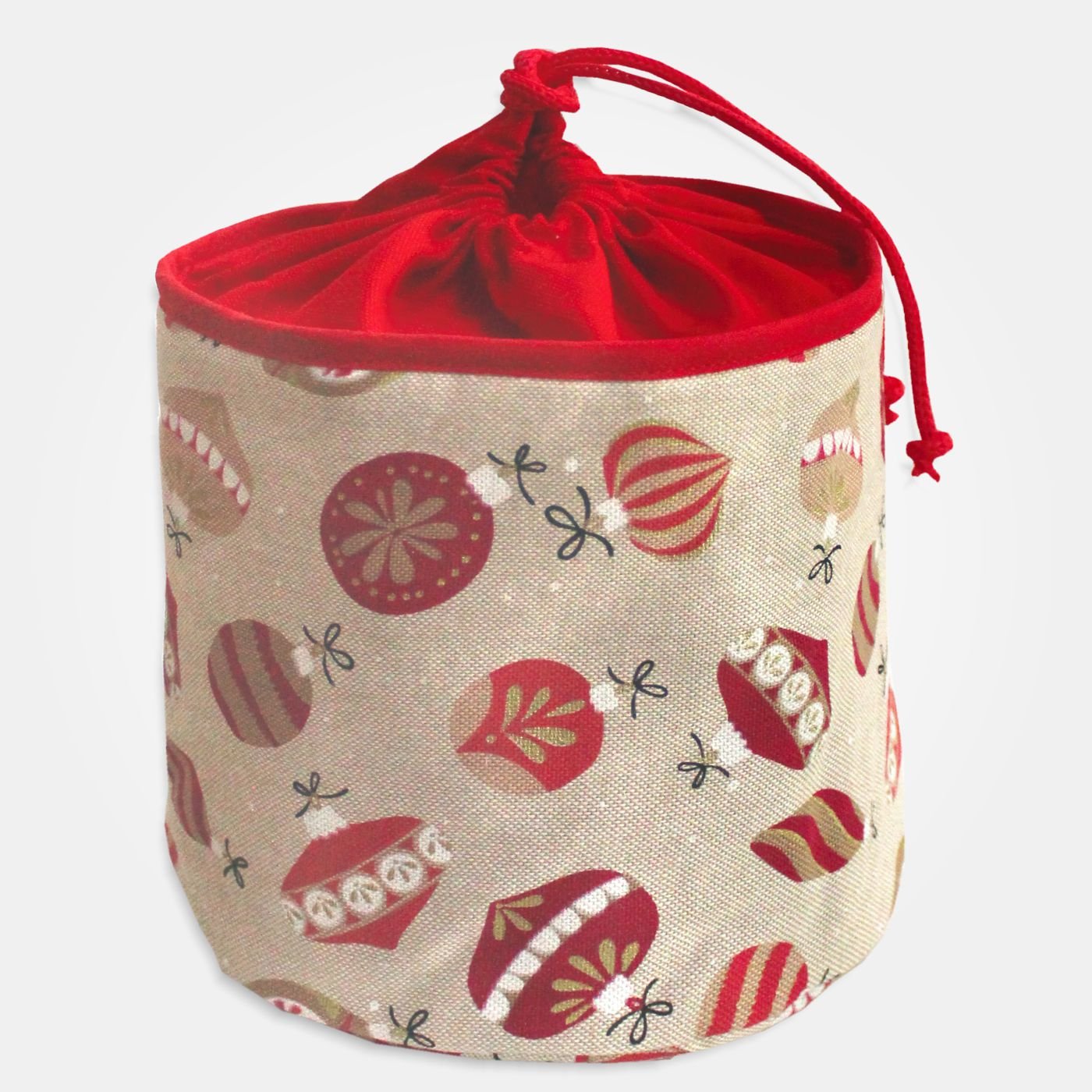 Cestino porta pane rotondo a forma di secchiello è realizzato in tessuto fantasia “palle di Natale”.