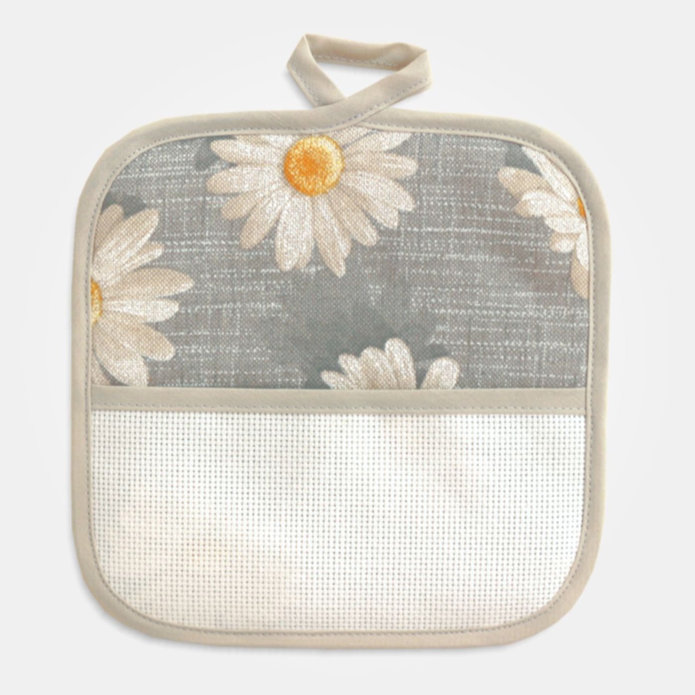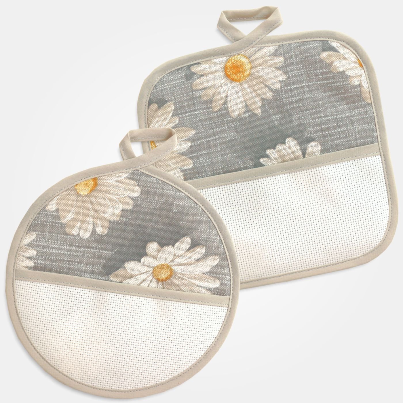 Set di due presine in tessuto grigio a fantasia margherite con inserto in tela Aida 55 fori da ricamare.