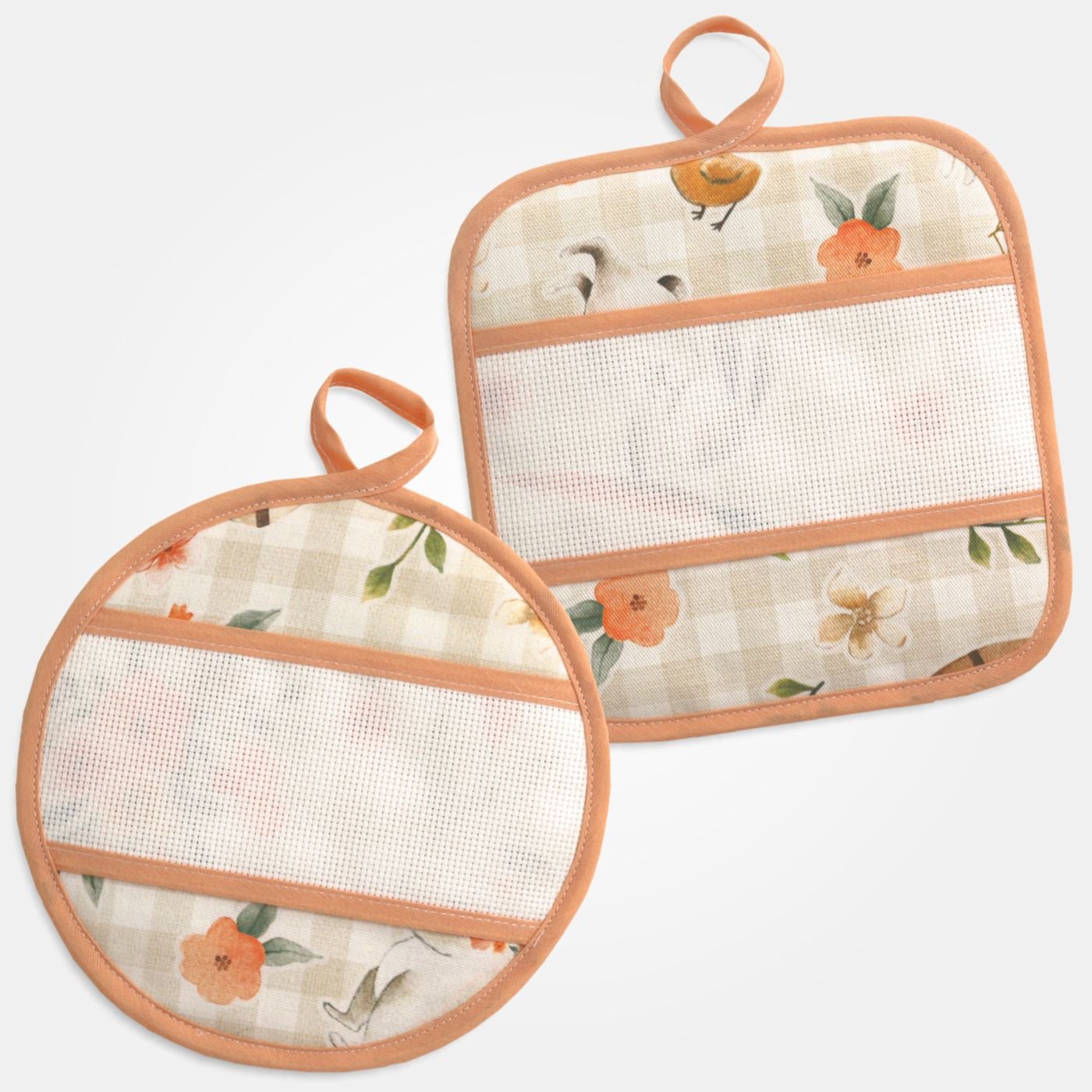 Set di due presine in tessuto fantasia pasquale con inserto in tela Aida 55 fori da ricamare.