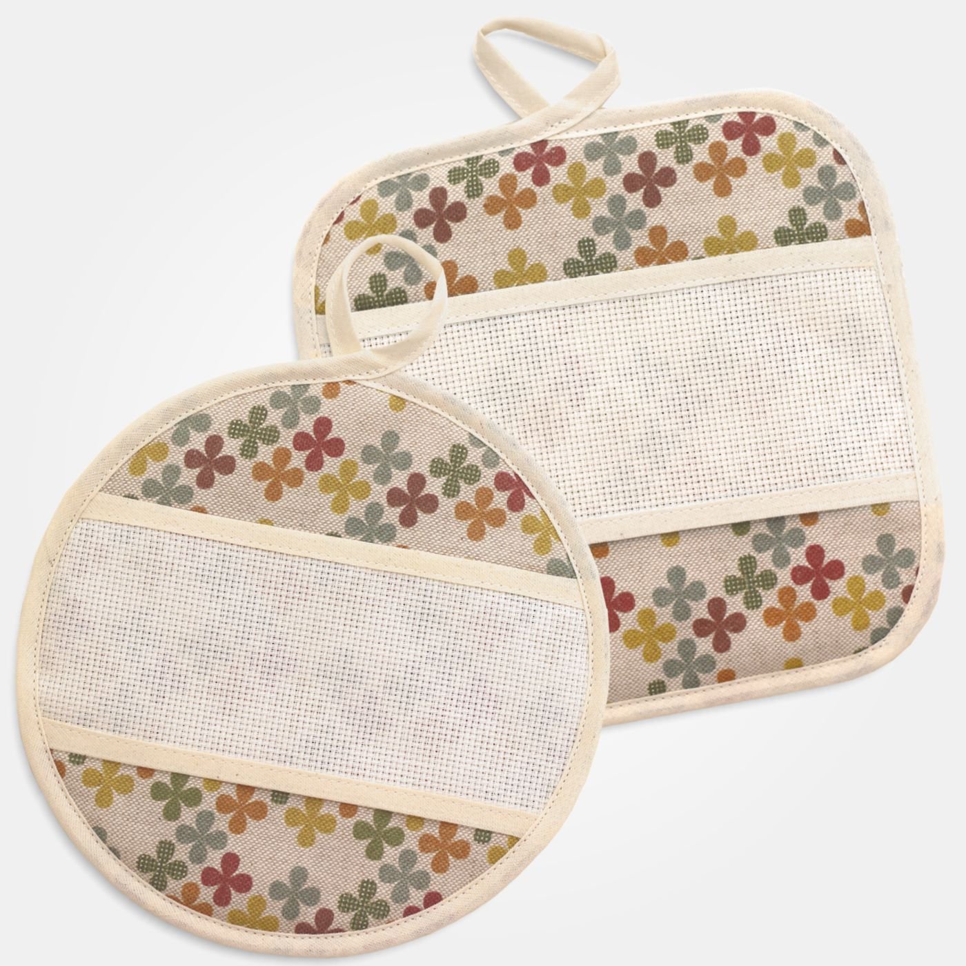 Set di due presine in tessuto fantasia multicolor con inserto in tela Aida 55 fori da ricamare.