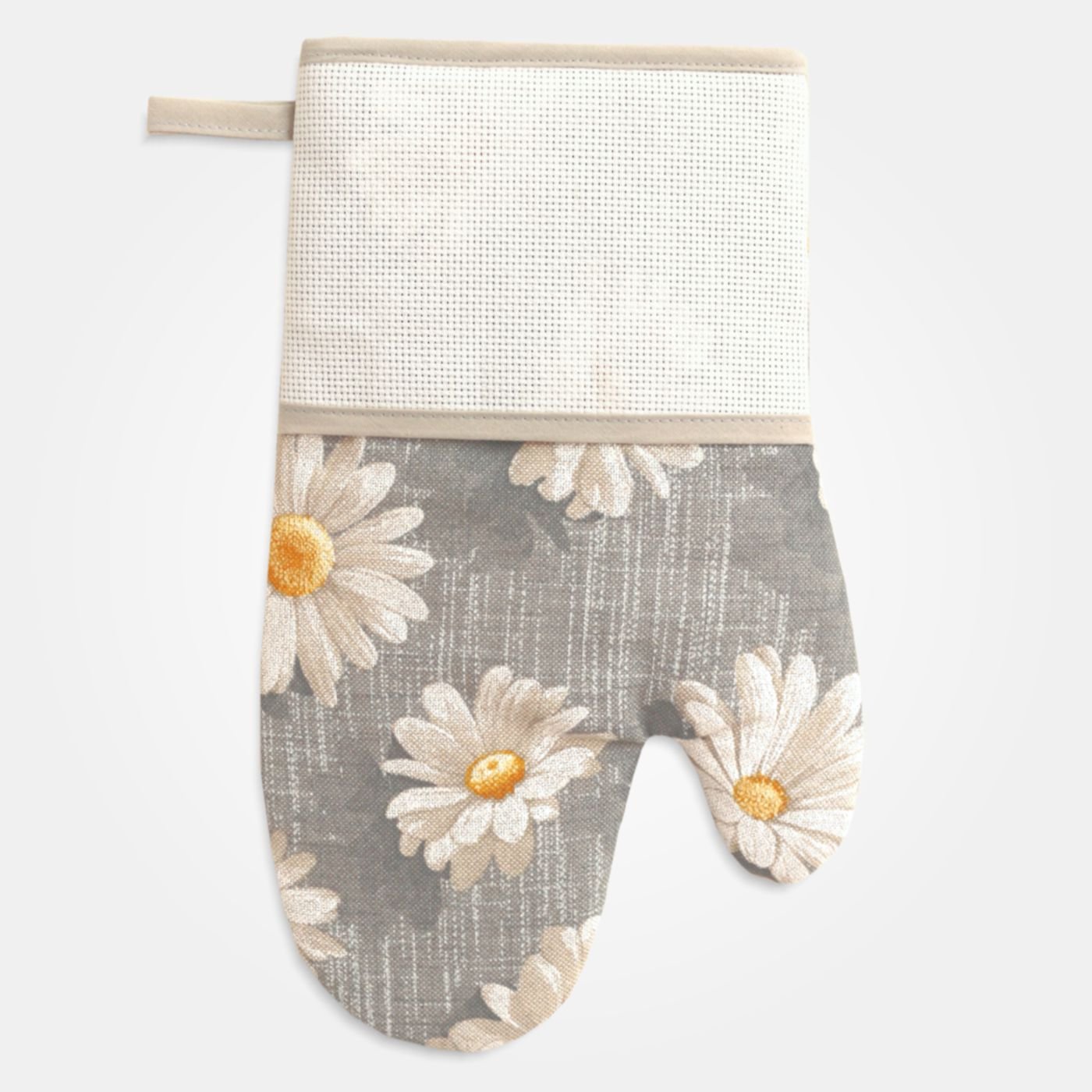 Set da forno composto da: 1 guantone e 2 presine (una tonda e una quadrata) in tessuto grigio a fantasia margherite.