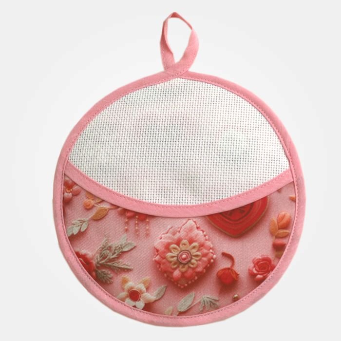Set da forno composto da: 1 guantone e 2 presine (una tonda e una quadrata) in tessuto rose e cuori e inserti in Tela Aida.