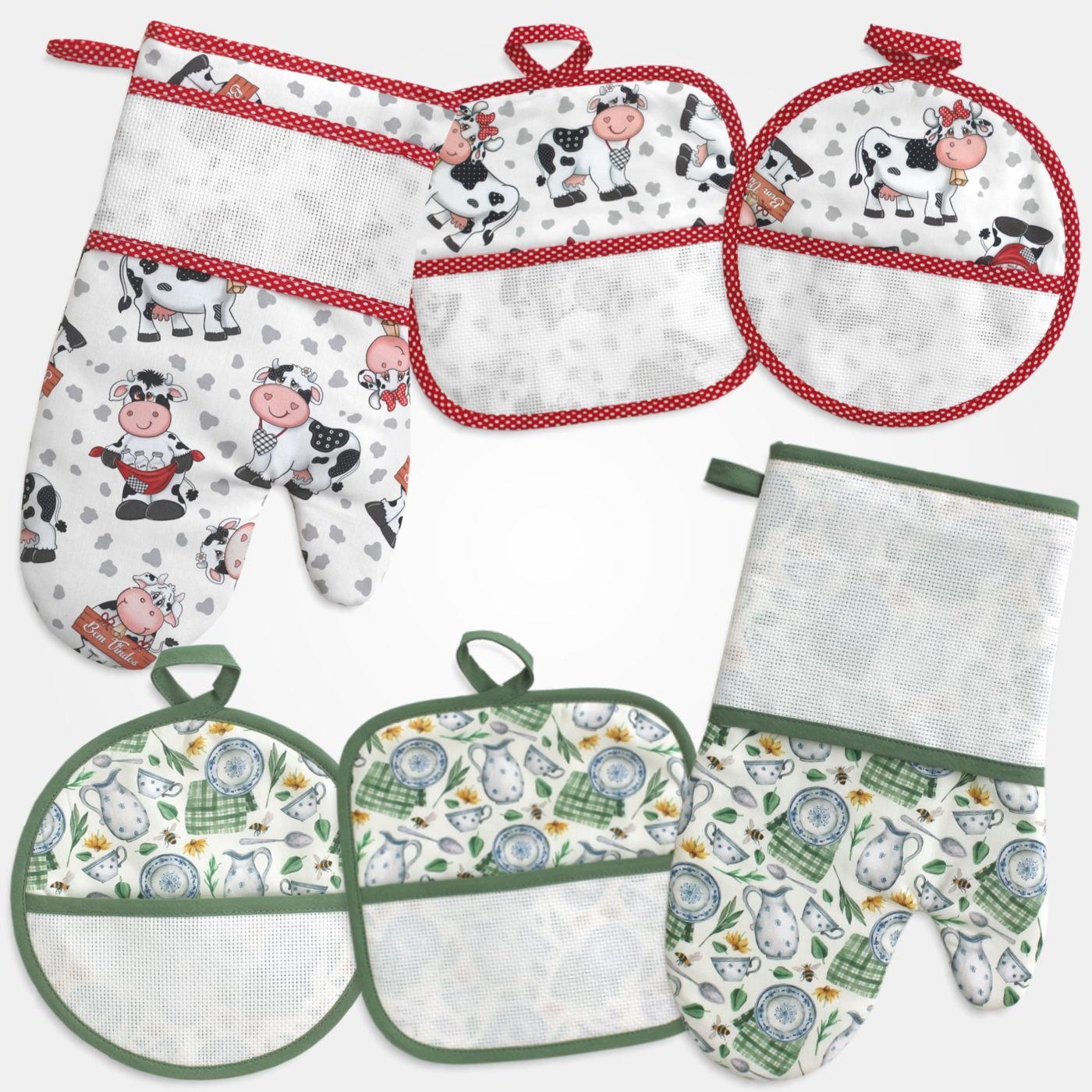 Set guantone e due presine da forno in tessuto trapuntato, trattato per la coibentazione del calore e caratterizzato da tasche in tela Aida 55 fori da ricamare a punto croce. Il guantone molto grande, misura di lunghezza cm 30, offre così una maggiore copertura del polso, evitando scottature. Questo set è progettato con sbieco di cotone che termina formando degli appendini, in modo tale da poter riporre presine e guantone quando non in uso sui ganci della cucina.