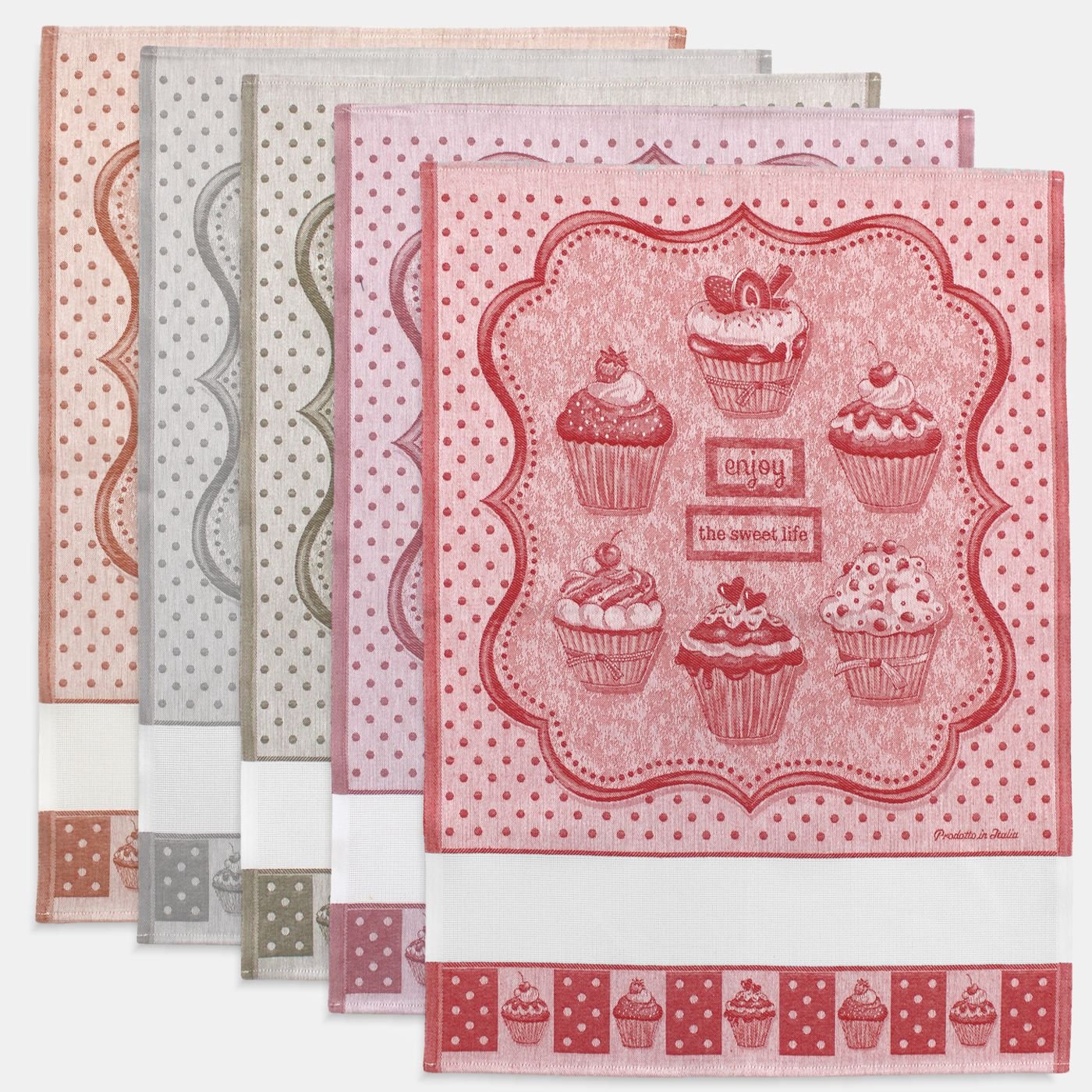 Strofinaccio da cucina in cotone ritorto con lavorazione jacquard, fantasia cupcakes.