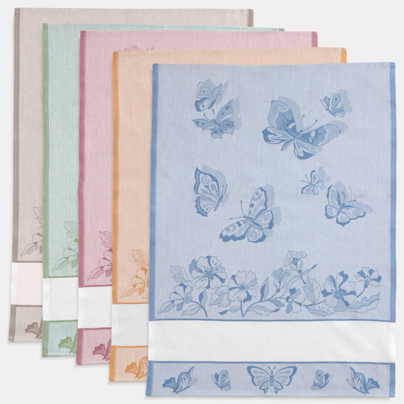 Strofinaccio da cucina in cotone ritorto con lavorazione jacquard, fantasia farfalle. Il canovaccio presenta una Fascia di cm.9,5 in tela aida 55 fori ricamabili e un’asola per essere appeso.