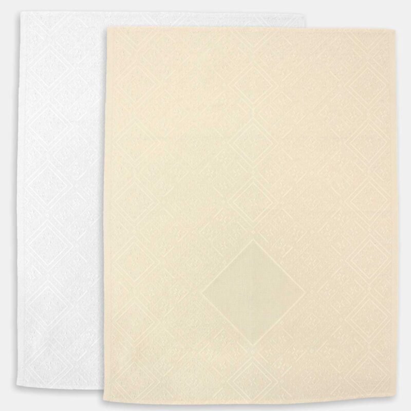 Strofinaccio della tessitura artistica chierese con Irene con rombi ripetuti e inserto di tela Aida a rombo centrale.