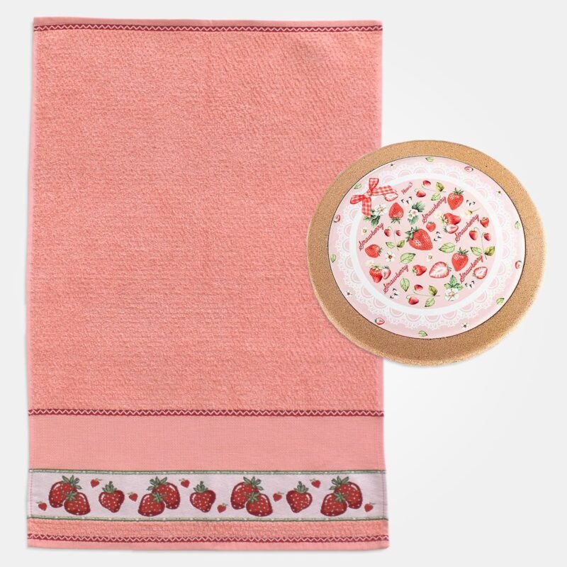 - Strofinaccio in spugna rosa con inserto in tela Aida 55 fori da ricamare a punto croce decorato da bordura a fantasia fragole.