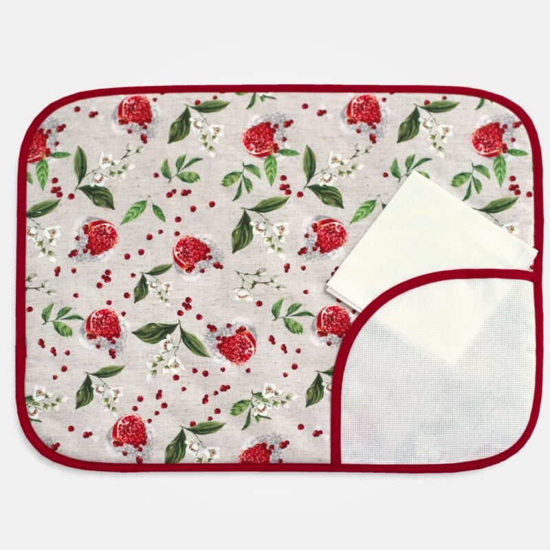 Tovaglietta americana con retro trapuntato, realizzata con un vivace tessuto in fantasia melograni con tasca in tela Aida 55 fori e tovagliolo.