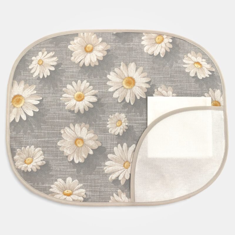 Tovaglietta americana in tessuto grigio a fantasia margherite con tasca in tela Aida 55 fori da ricamare e tovagliolo.