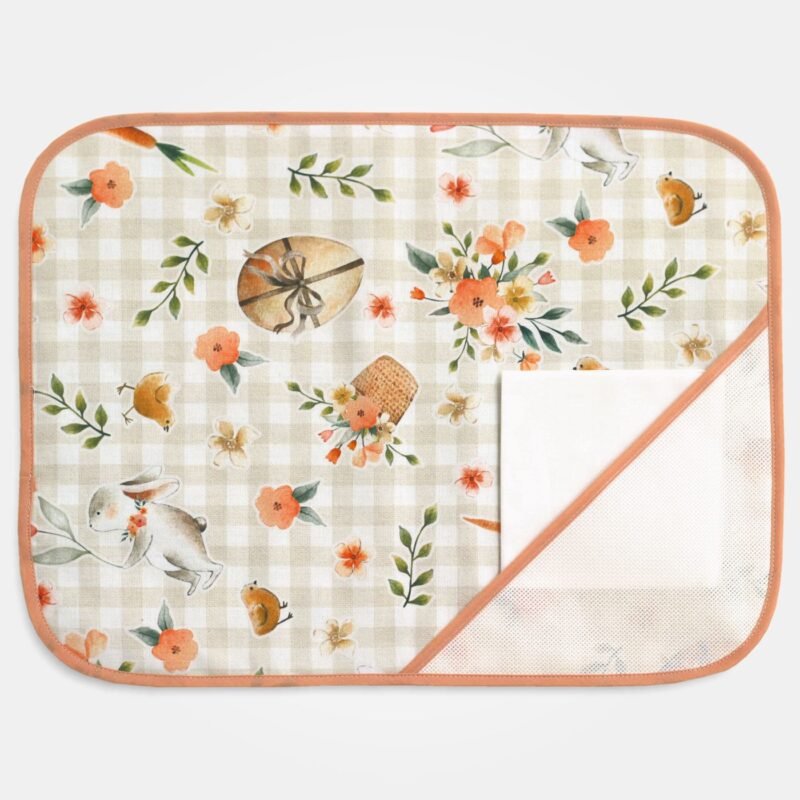 Il tessuto fantasia pasquale, fresco e luminoso, rende la tovaglietta non solo funzionale ma anche un elegante elemento decorativo per la cucina o la sala da pranzo, capace di creare un’atmosfera calda e accogliente.