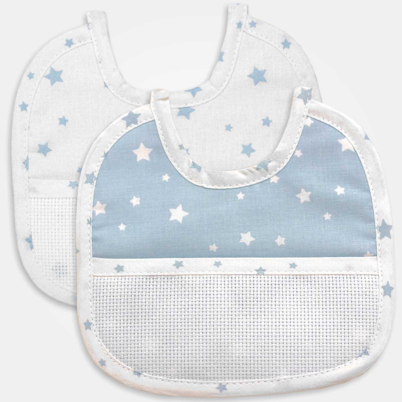 Bavaglina per bimbo realizzata con tessuti di primissima qualità: piquet mille righe a fantasia fiocchetti e tela Aida bianca (55 fori).