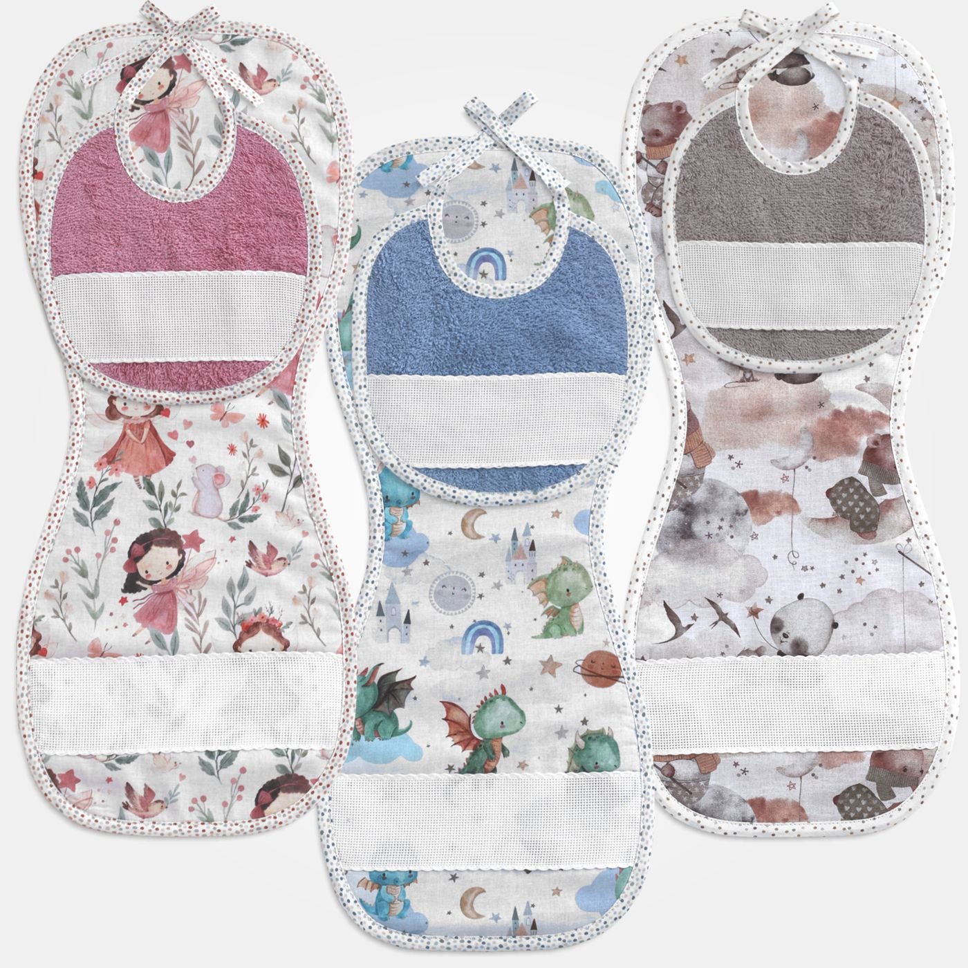 Copri spalla neonato (asciugaspalla): ideale per proteggere i vestiti, con parte frontale in tessuto fantasia a tema favola e retro in morbida spugna colorata altamente assorbente. Completo di banda in tela Aida (55 fori) da ricamare e rifiniture in sbieco di cotone bianco con pois coordinati.