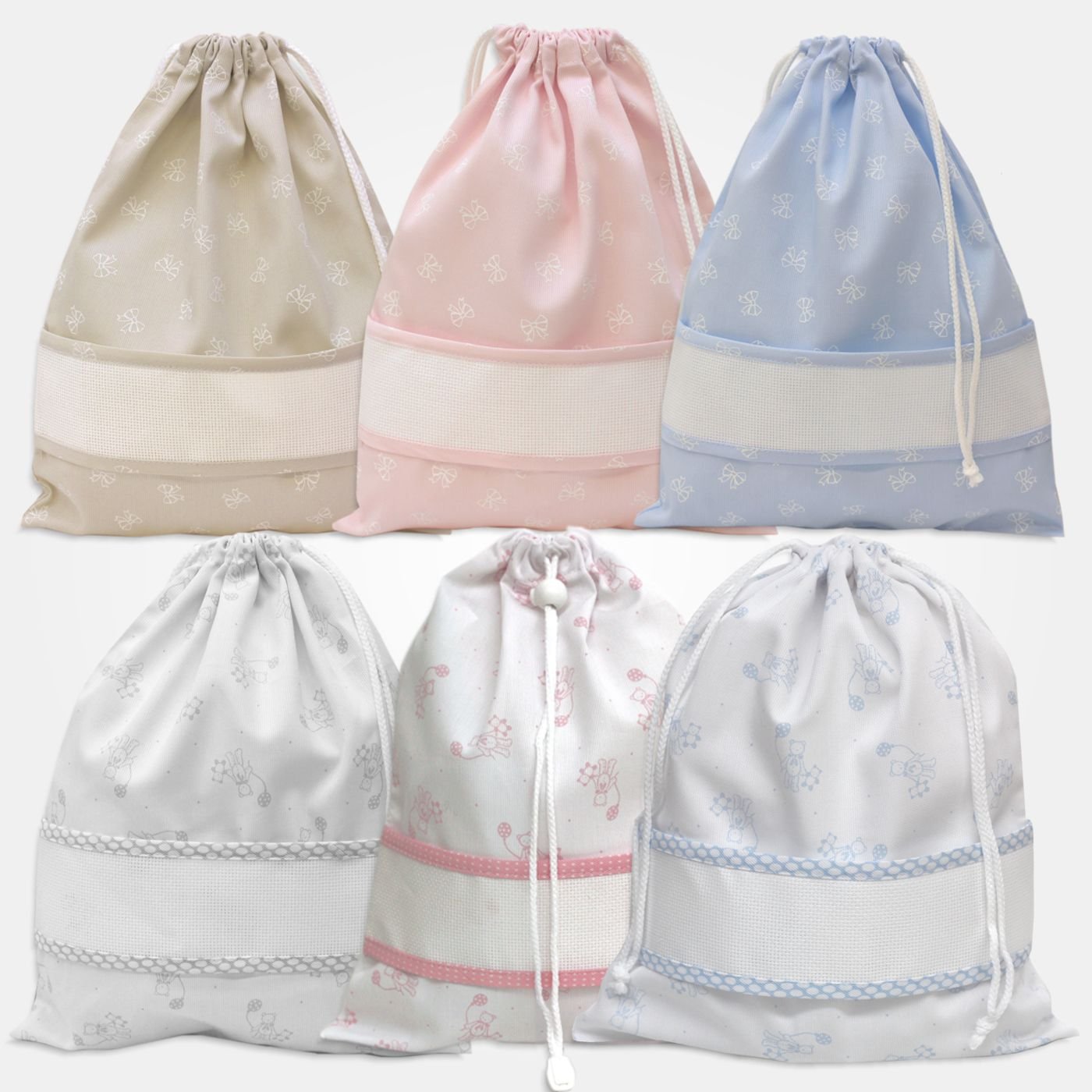 Sacchetto porta corredino da neonato in tessuto 100%cotone con striscia in tela aida bianca 55 fori da ricamare a punto croce. Chiusura con coulisse bianca. Questo sacchetto è perfetto da utilizzare in ospedale per i primi cambi del vostro bambino, la tela aida inoltre permette di poterlo personalizzare con il ricamo del nome del bebè.