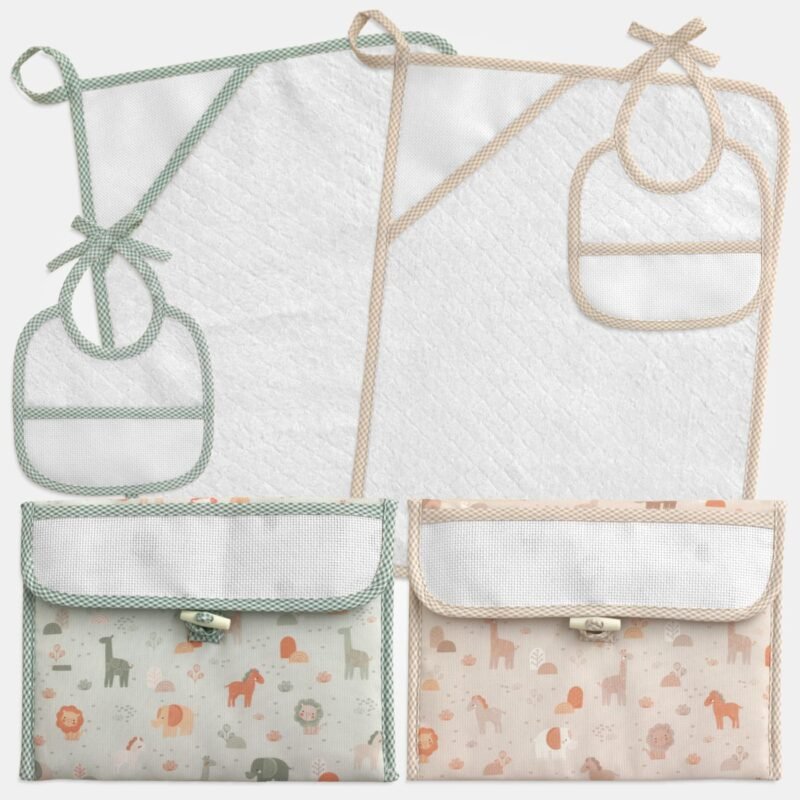Set neonato “Africa” composto da: busta, bavaglia e salvietta. Tutti e tre hanno un inserto in tela Aida da ricamare a punto croce.