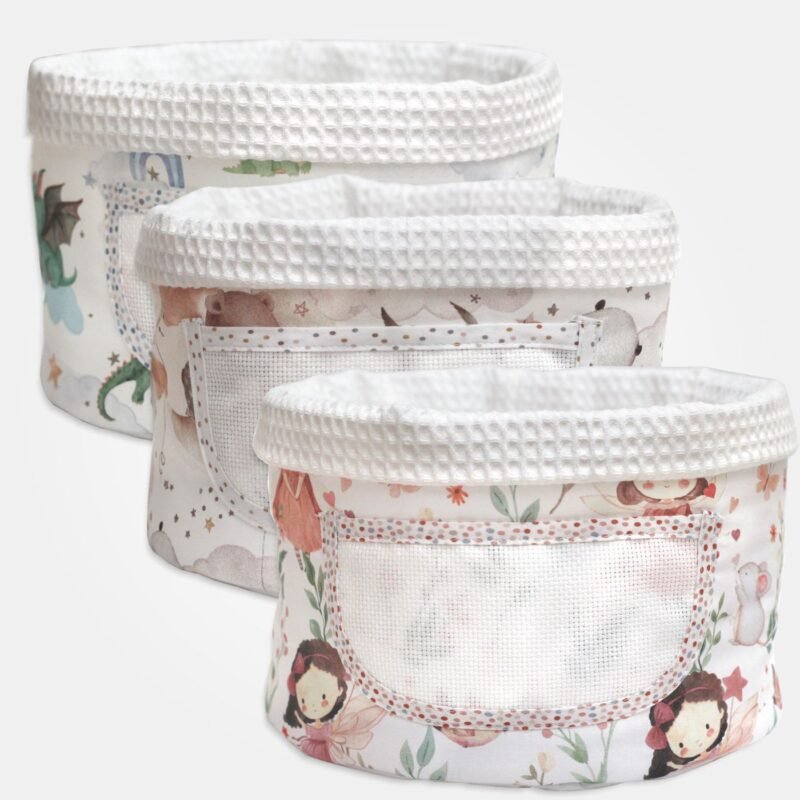 Il cestino porta oggetti “Favola” è realizzato in morbido tessuto di cotone bianco con una delicata fantasia a tema fiabesco, impreziosito da un bordo in tessuto nido d’ape bianco e da una tasca frontale in tela Aida (55 fori), perfetta per essere personalizzata con un ricamo.