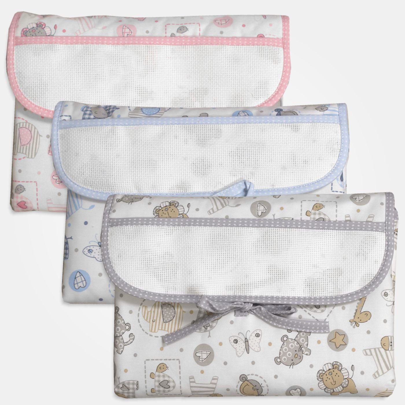 Fasciatoio a busta da viaggio ripiegabile, con inserto in tela aida 55 fori per il ricamo a punto croce, realizzato in piquet mille righe con una stampa a tema animaletti. Trapuntato internamente con soffice ovatta di poliestere e foderato in morbida spugna 100% cotone. Quando non in uso si chiude comodamente con un laccio. È ideale per un viaggio o per un semplice spostamento con il vostro bebè. Grazie alla sua forma a busta pieghevole e alle sue dimensioni compatte questo prodotto è facilmente trasportabile, ed è l’ideale per essere usato in tutte le occasioni in cui si è fuori casa.