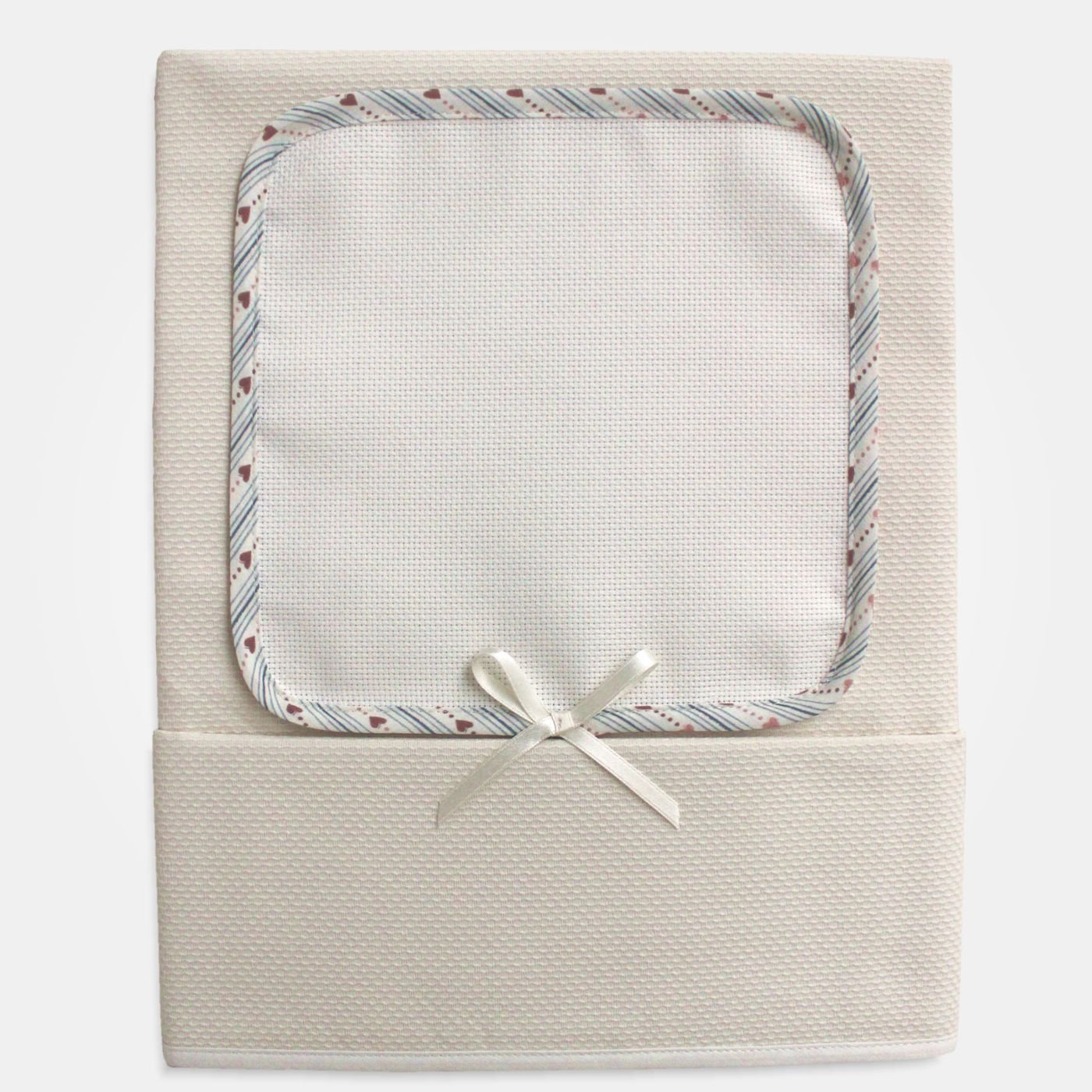 Il pannello centrale è realizzato in tela Aida 55 fori, rifinito con uno sbieco a righe decorato da piccoli cuori e impreziosito da un fiocchetto applicato al centro, per un tocco romantico e raffinato.
