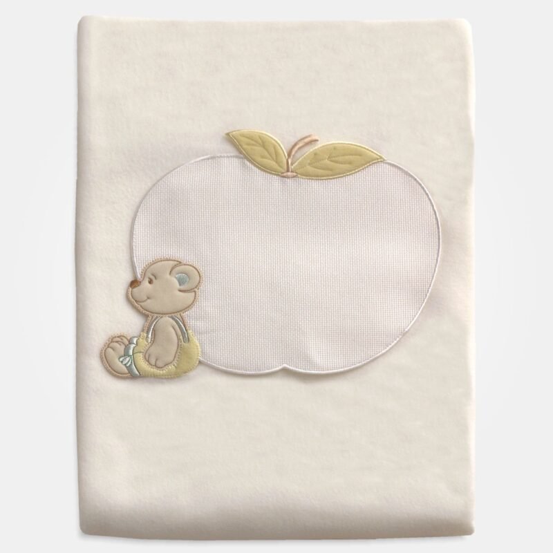 Copertina da lettino in morbido pile color panna, impreziosita da un’applicazione a forma di mela realizzata in tela Aida 55 fori, arricchita da un delicato motivo con orsetto.