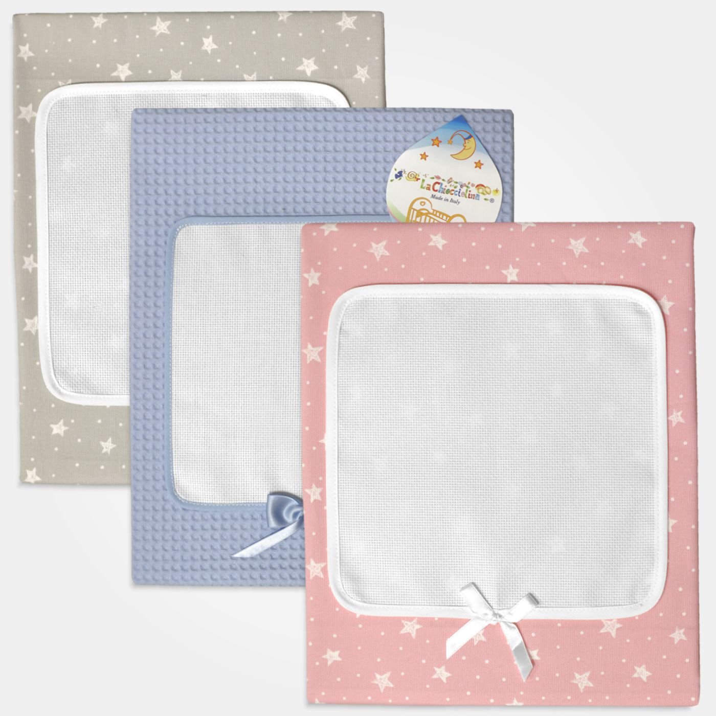 Sacco copripiumino per culla o carrozzina, arricchito da un elegante inserto centrale in tela Aida 55 fori, ideale per personalizzazioni a punto croce.