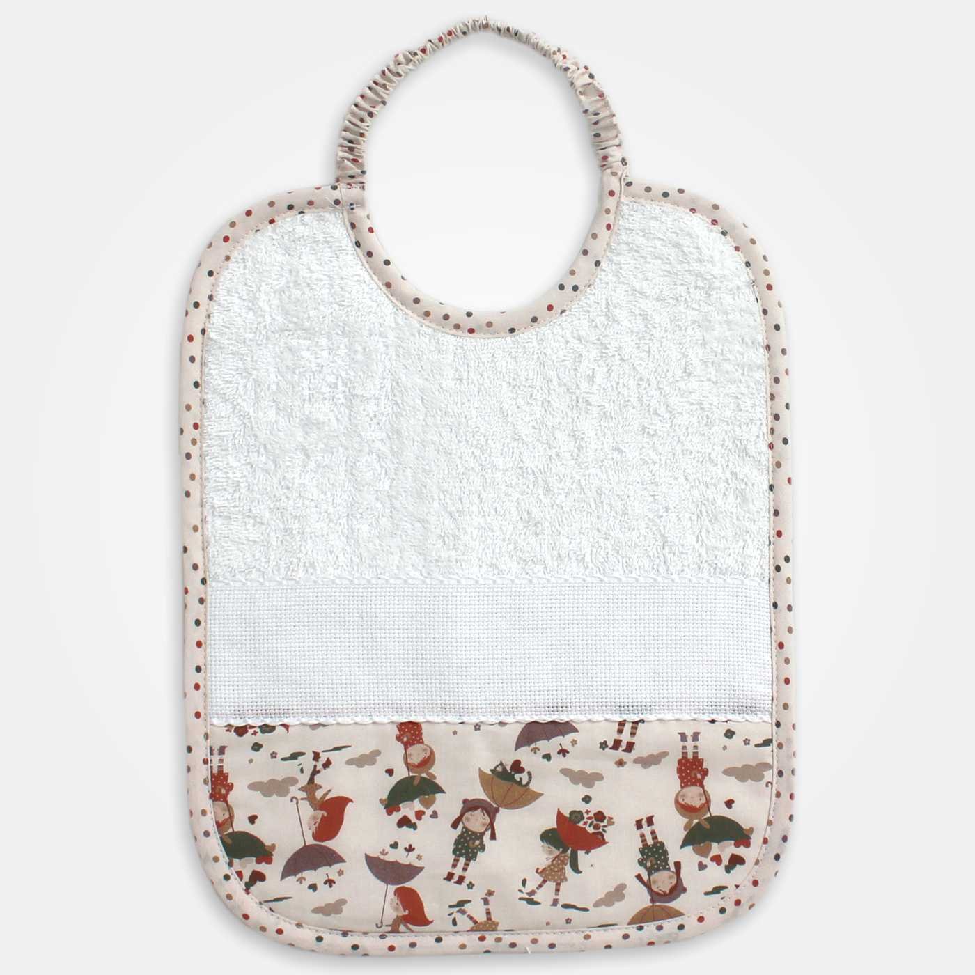 Bavaglia in spugna per asilo con inserto in tessuto ballerina ombrello e dotata di banda in tela Aida 55 fori applicata.