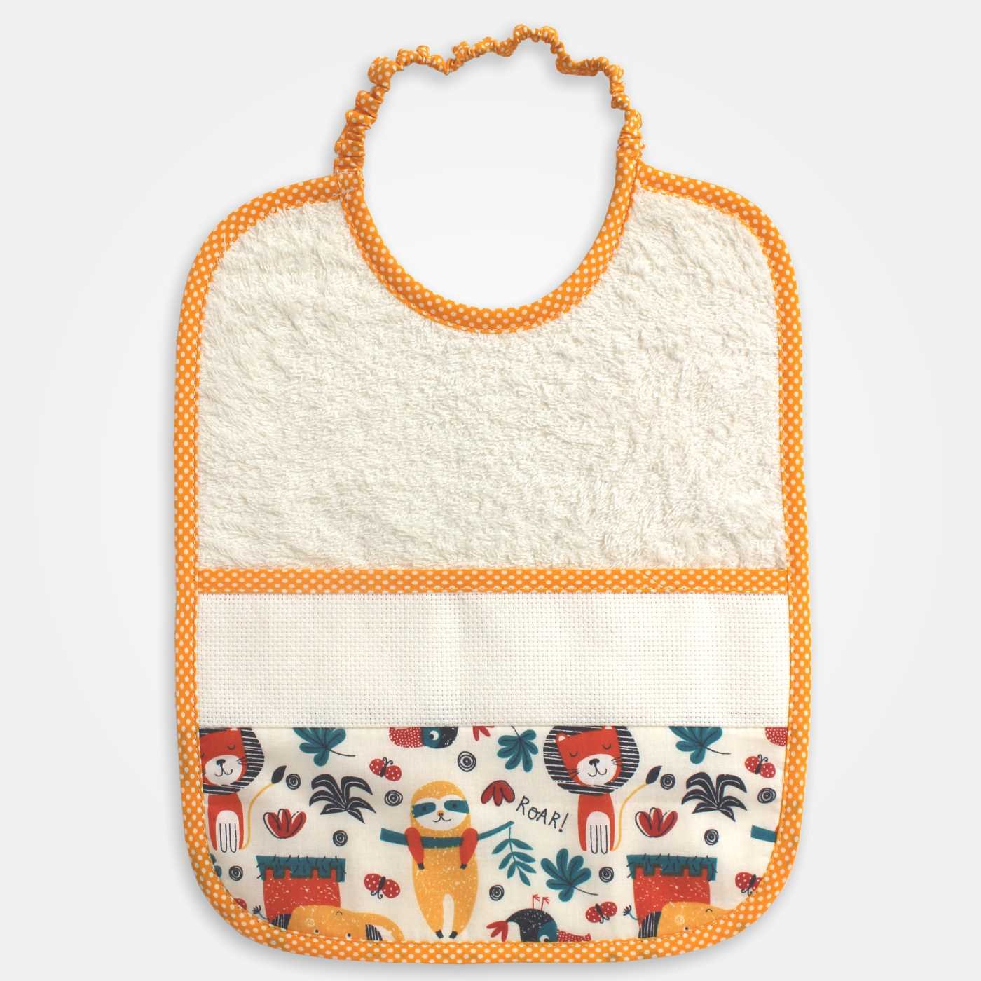 Bavaglia in spugna per asilo con inserto in tessuto animali savana e dotata di banda in tela Aida 55 fori applicata.
