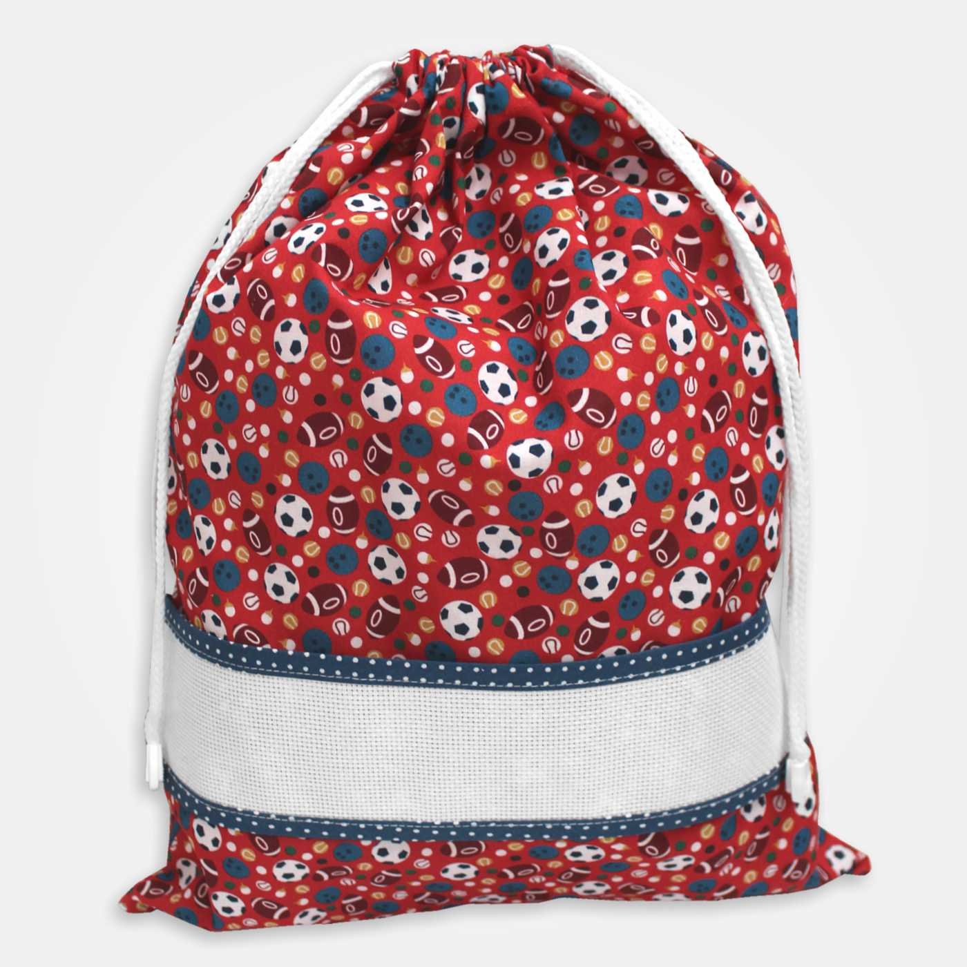 Sacchetto per asilo in tessuto di cotone a fantasia palloni, dotato di banda in tela Aida 55 fori da ricamare.