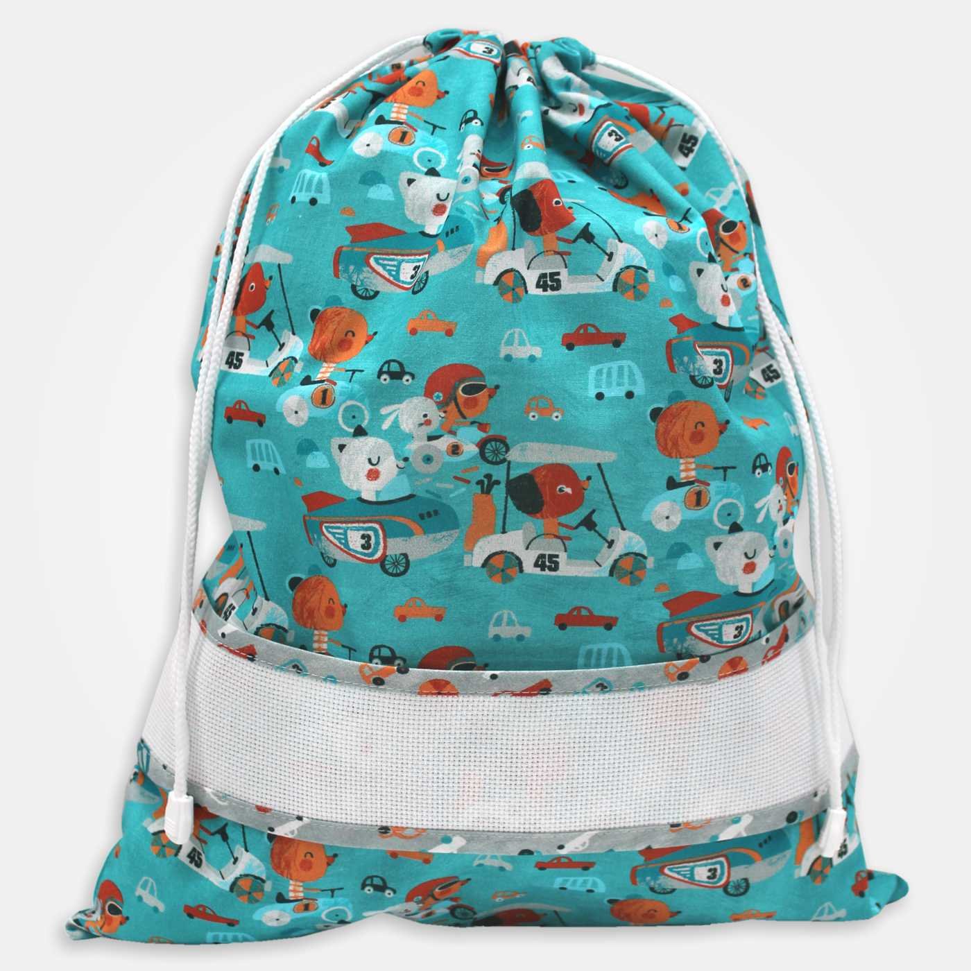 Sacchetto per asilo in tessuto di cotone a fantasia animali in auto, dotato di banda in tela Aida 55 fori da ricamare.