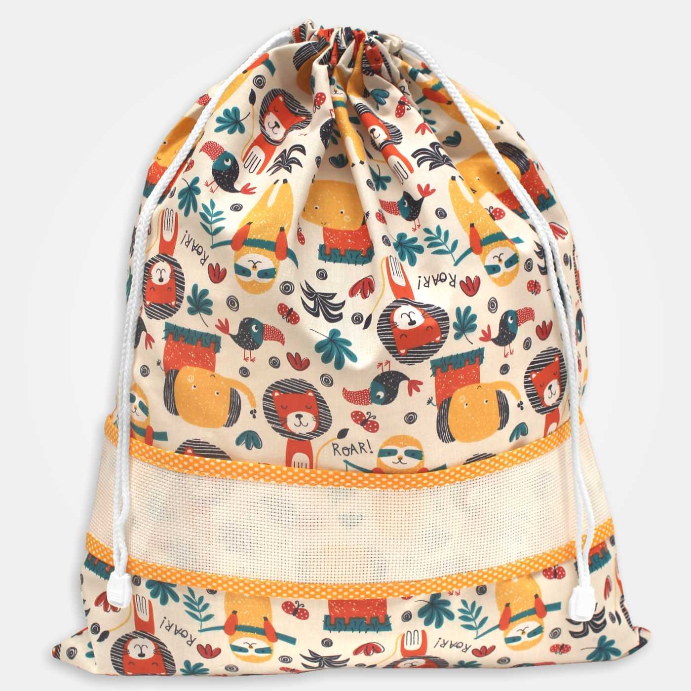 Sacchetto per asilo in tessuto di cotone a fantasia animali savana, dotato di banda in tela Aida 55 fori da ricamare.