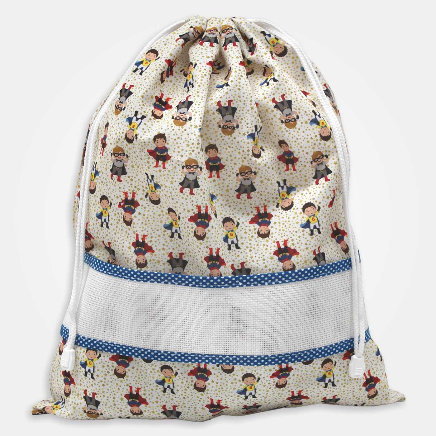 Sacchetto per asilo in tessuto di cotone a fantasia supereroi stelle, dotato di banda in tela Aida 55 fori da ricamare.