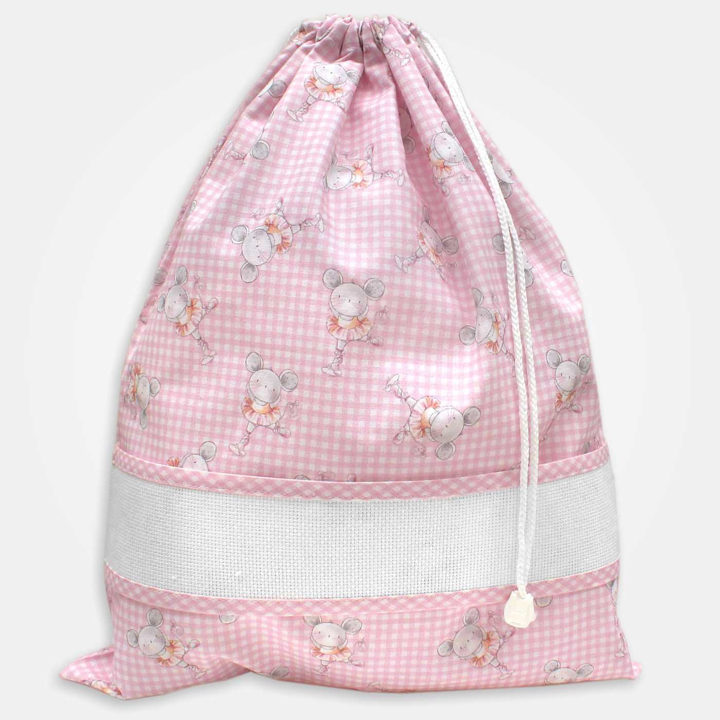 Sacchetto per asilo in tessuto di cotone a fantasia topina, dotato di banda in tela Aida 55 fori da ricamare.