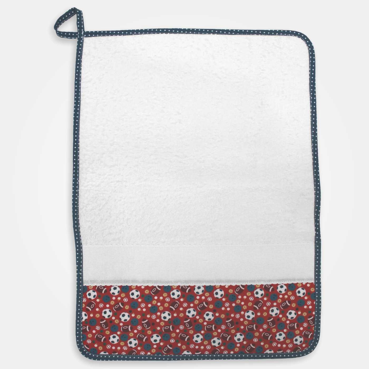 Salvietta in spugna per asilo con inserto di tessuto di cotone palloni e banda in tela Aida 55 fori applicata.