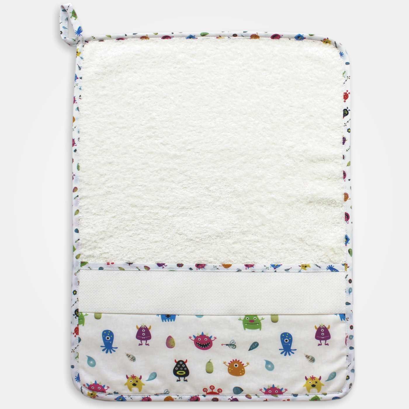 Salvietta in spugna per asilo con inserto di tessuto di cotone mostri e banda in tela Aida 55 fori applicata.
