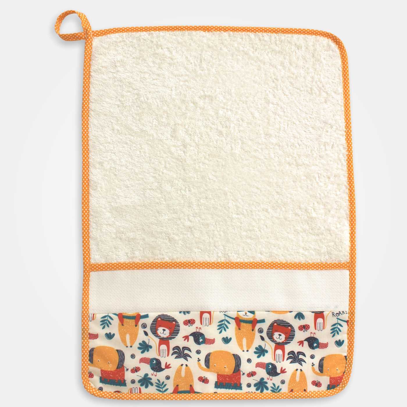 Salvietta in spugna per asilo con inserto di tessuto di cotone animali savana e banda in tela Aida 55 fori applicata.