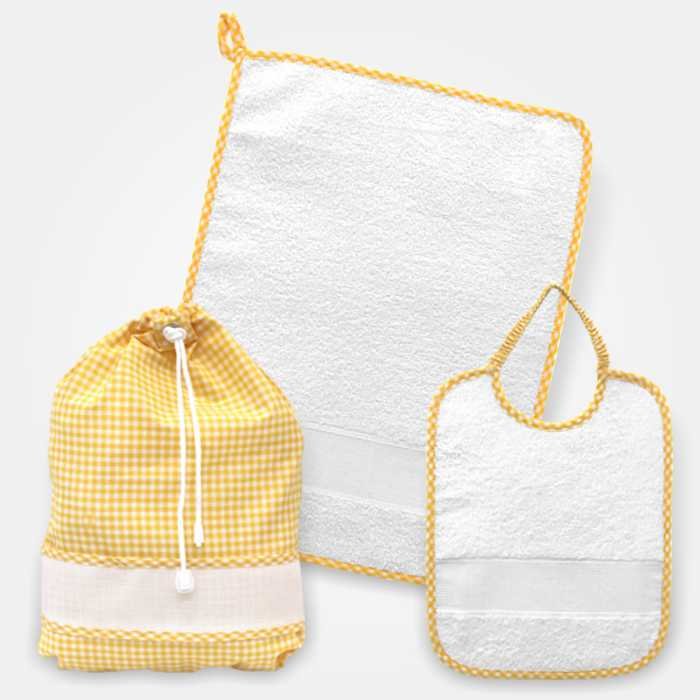 Set per l’asilo composto da bavaglia, salvietta e sacchetto piccolo.