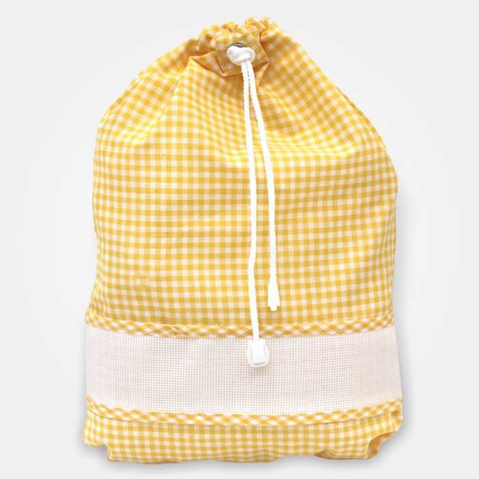 Sacchetto piccolo in tessuto quadretti con banda in tela aida bianca e chiusura con coulisse.