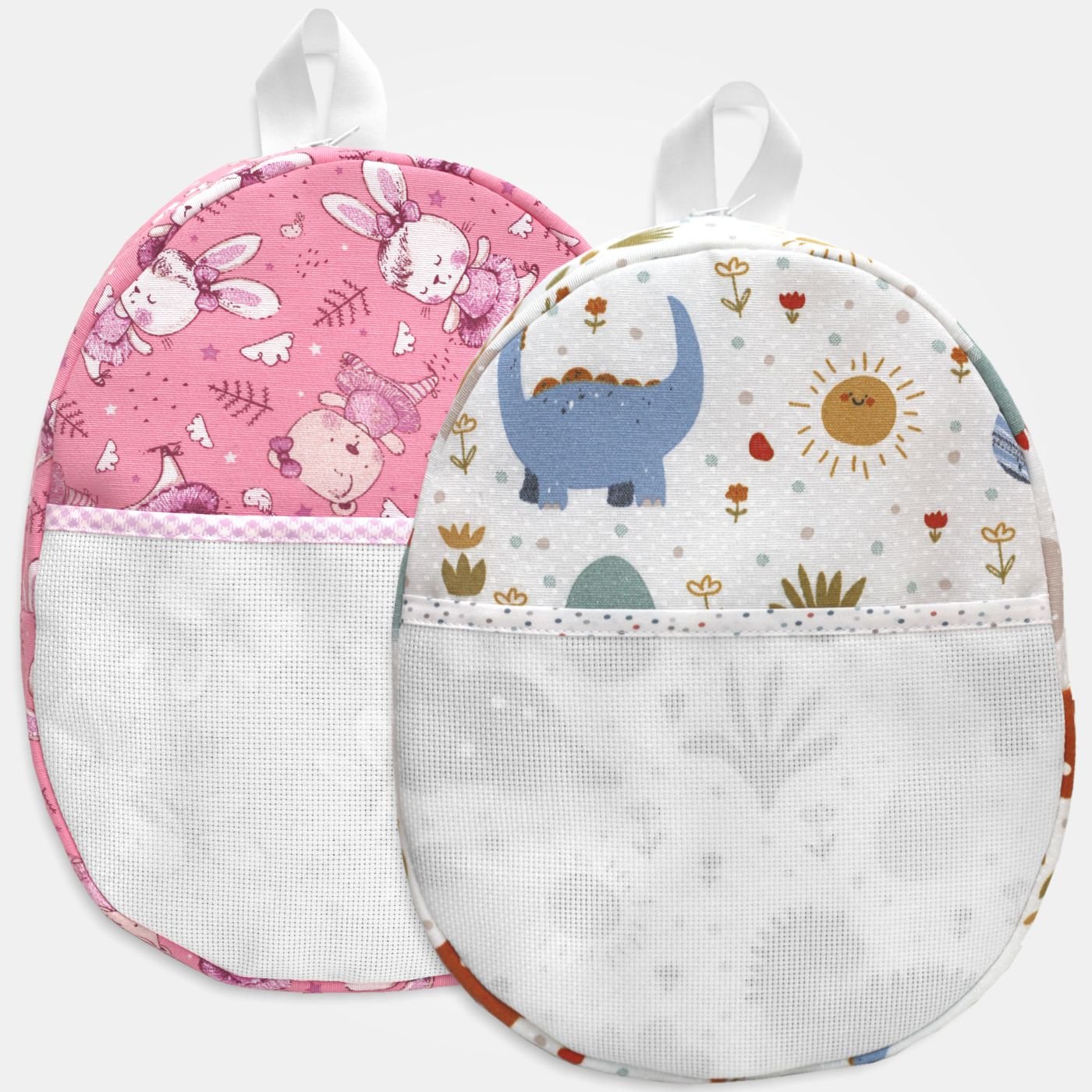 Zainetto per asilo realizzato in tessuto fantasia, disponibile con simpatici dinosauri o coniglietti ballerina.