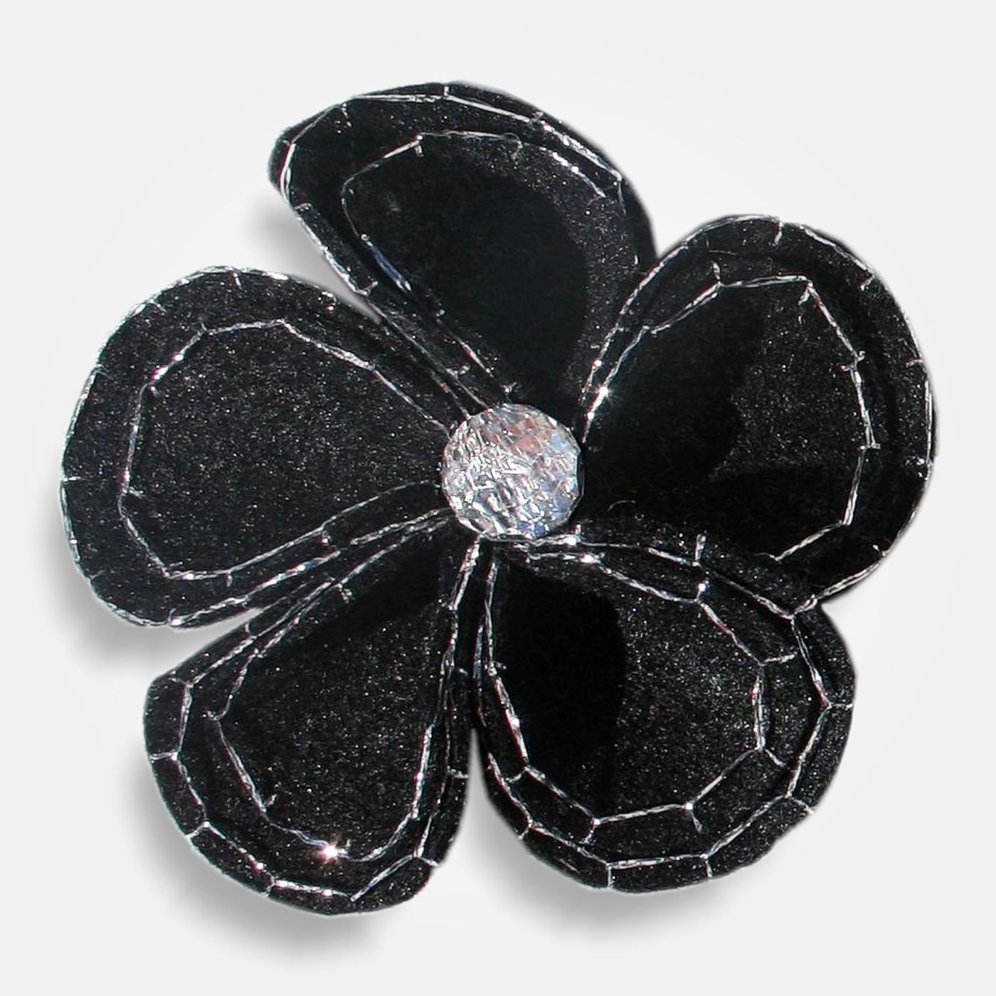 Aggiungi un tocco di eleganza artigianale al tuo look con questa raffinata spilla in feltro, realizzata a forma di fiore multilivello nera con dettagli in lurex argento e perla centrale.